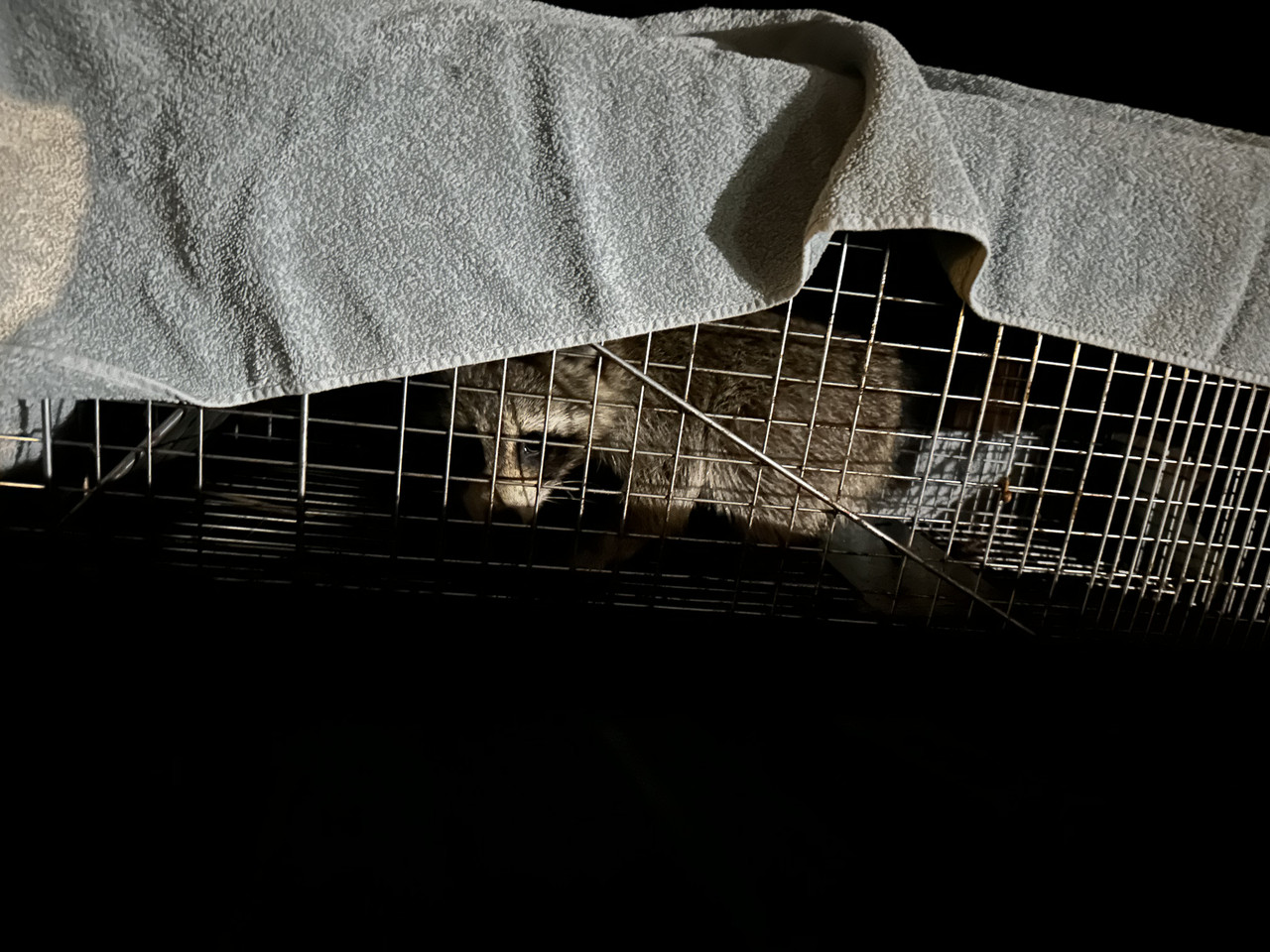 The first day I put the trap out, he somehow got the bait out and did not get caught. The second day, he got caught and I took his arse for a ride.