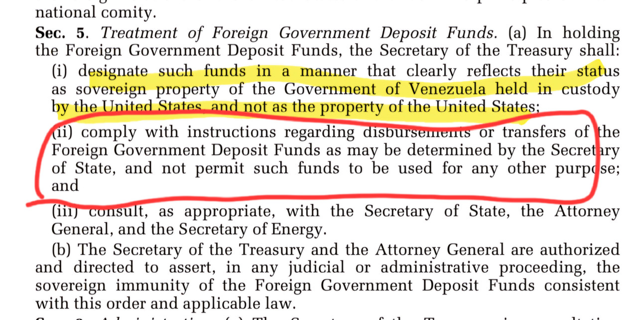 For reference, here's the language Team Trump will use to bypass Congress: "It's not federal money. It belongs to the Venezuelan Government. President Trump just gets to decide how it is spent."