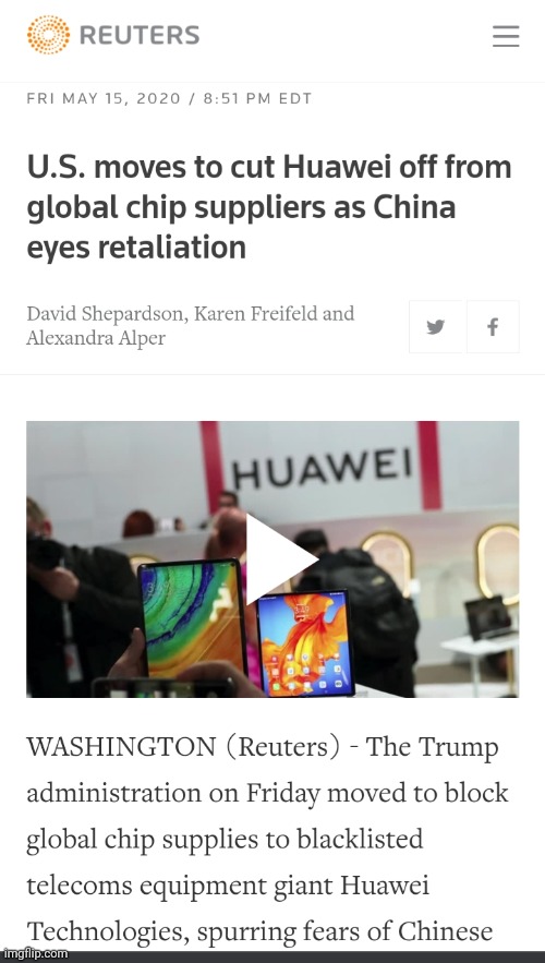 The reaction from China was swift, with a report on Friday by China's Global Times saying Beijing was ready to put U.S. companies on an "unreliable entity list," as part of countermeasures in response to the new limits on Huawei.