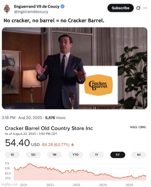 As did Cracker Barrel’s corporate promotion of woke idiocy. Go work, go broke.