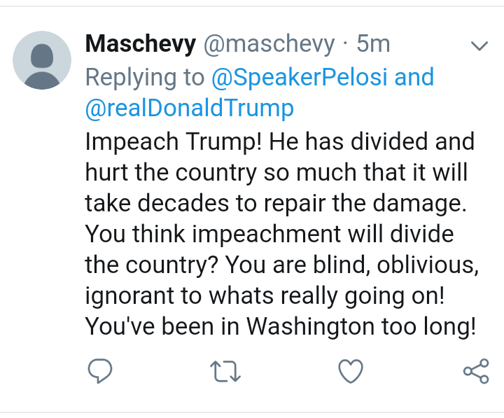 #Pelosi; Your latest comment that Trump is not worth pursuing impeachment is very upsetting. He may not be worth it but MADAM SPEAKER. YOUR COUNTRY IS!!!!!Get off your A$$$ and do something!