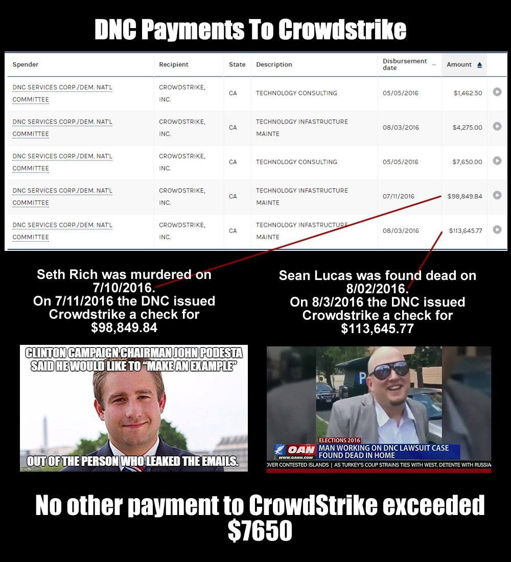 Nothing... I dont give a shite about crowdstrike... but if Seth Rich indeed leaked info from the DNC (and this is SEPARATE from the Podesta "hack"), then Crowdstrike's info about Russia hacking is bullshite. Or if Russia hacked anything, which they may well have, they could well have kept it for themselves as blackmail material.