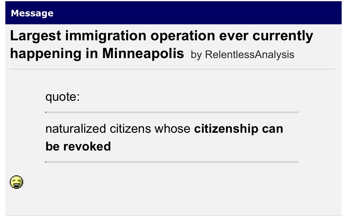 quote:Bookmark this, and repost when the first naturalized US citizen from Somalia has his citizenship revoked for child care fraud.