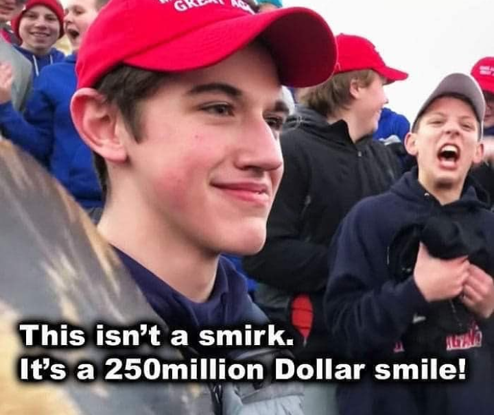Nick has become a millionaire just by standing his ground with a MAGA hat and smiling.