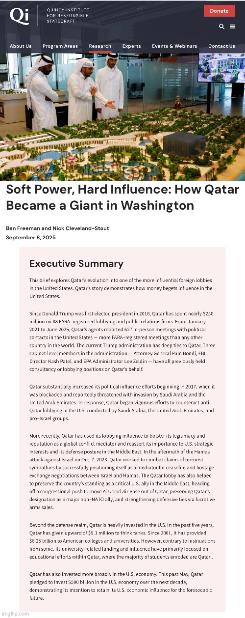 Huckabee, Bondi, Patel — all have been on Qatar’s payroll at one time or another. So apparently, Qatar influence peddling is only a problem when it targets someone outside the Trump in-club.