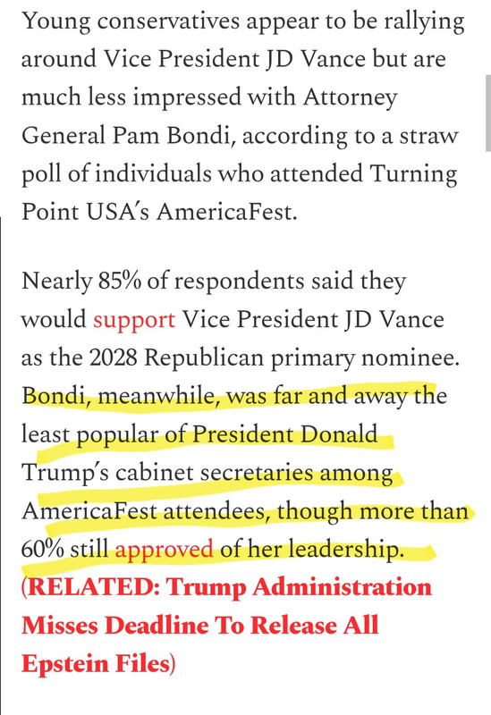 This Is almost as bad as Vox's post on not questioning Trump-- Wait for the plan blah blah blah. Pam Bondi was caught on video unprofessionally speaking of child porn regarding Jeffrey Epstein to a stranger.