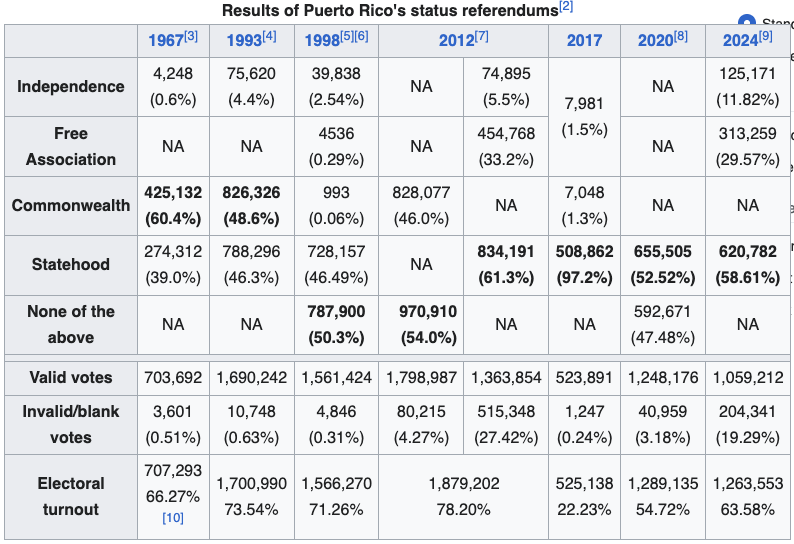 And most of the knowledgeable Puerto Ricans don't want to be a state either...their taxes will go up since they (mostly) don't pay US federal income tax. They do pay SS, Medicare and a few others.