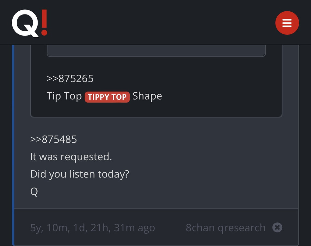 A skeptic of Q asked that Trump incorporate "tippy top shape" into a speech to prove the operation is real. Trump did just that in his annual Easter address from the White House.