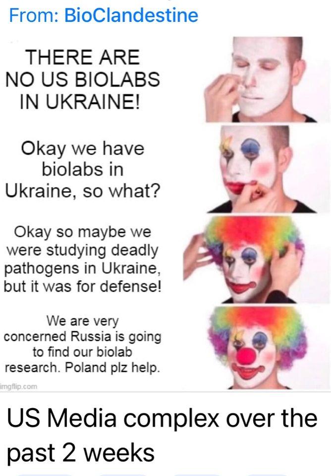 quote:Rubio clarified via Victoria Nuland (REAL QUICKLY to get ahead of this) that the biowarfare labs exist. They denied their existence then all of a sudden they existed.