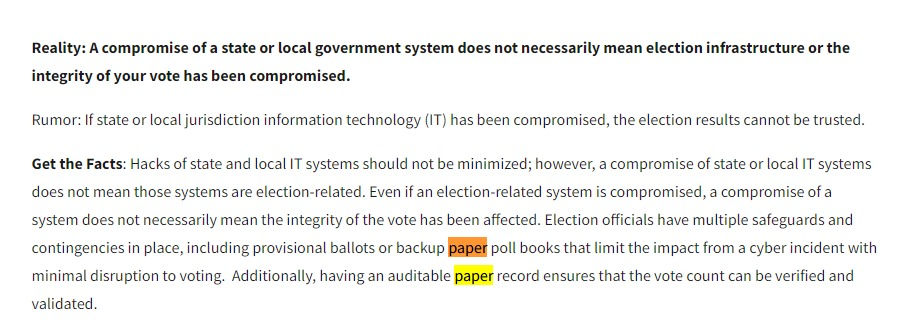 CISA's charter has all counties prepared to go with paper ballots and registration poll books as a back-up failsafe.