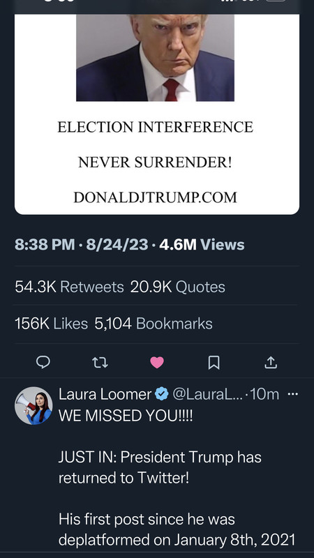 Probably just a bunch of people scrolling past Trump's first tweet in over 2 years being his mugshot.