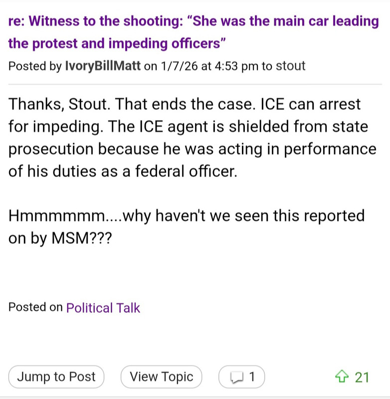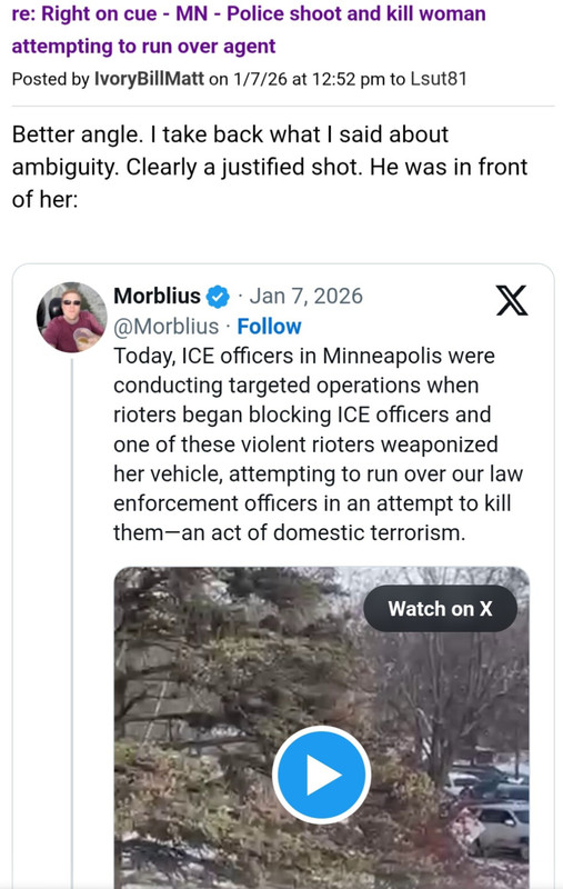 As to whether or not the detention of Good was lawful (which related to federal immunity from Minnesota prosecution), I said the agent was clear on those grounds when Stout showed evidence that Good wasn't just parked blocking one lane of traffic (a state law for which ICE did not have the power to detain), but that she was actively blocking the entire road such that ICE couldn't get around her. I never changed my mind on that. Here was my specific comment, less than 5 hours after my first on a workday afternoon.