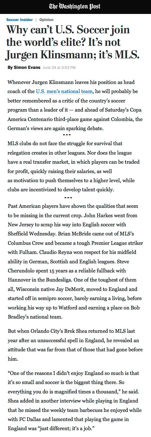 The MLS needs a lot of things but when you have owners pay 100 million franchise fee. They make what ever rules they have to that protects their investment. Even if it's detrimental to the growth of soccer in the states.