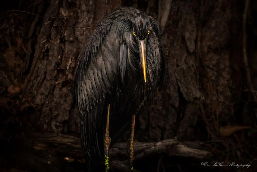 Slidell - Photographers named it the Goth Heron. Cool name and awesome look. Unfortunately it turned up dead in a ditch and was covered with creosote.