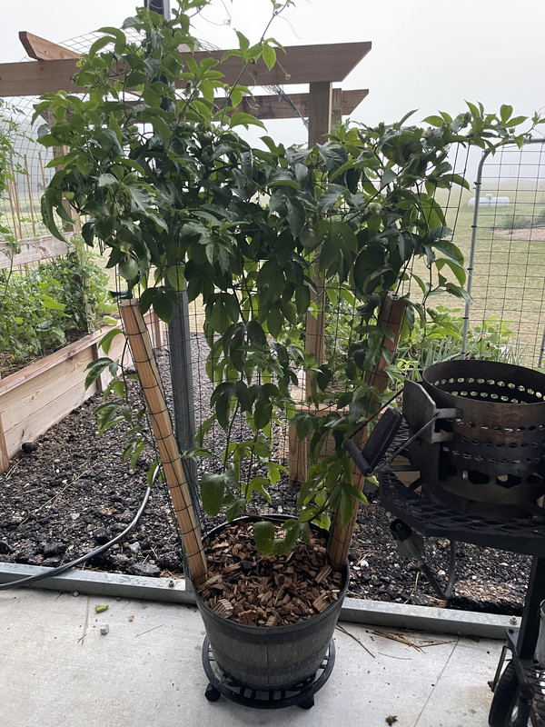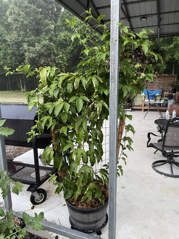 Here is my passion fruit trellis in a container. 2x4s bolted to inside of container and wire wrapped around the backside. I allow it to climb my shop posts then will cut back to trellis for winter.