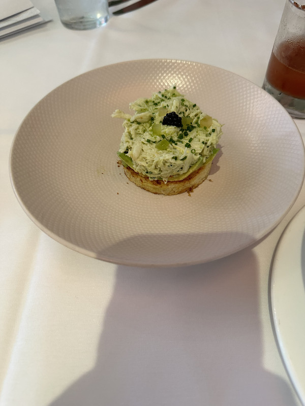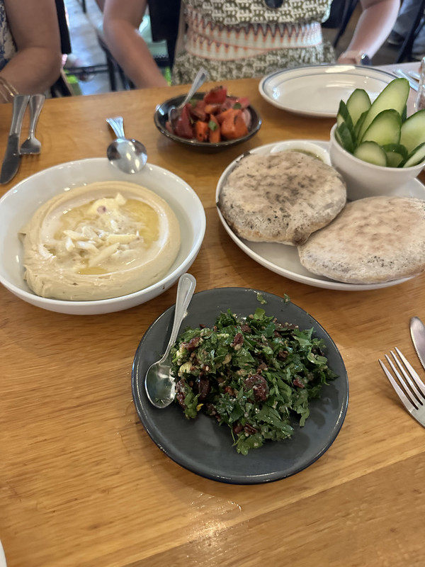 We kicked things off at Saba with a few glasses of Cabernet Franc (yes, we ordered a second round, it’s easier to splurge when you’re skipping a full dinner) and a killer spread: blue crab hummus, Moroccan carrots, baba ganoush, and tabbouleh. The reason you go to Saba is the blue crab hummus and the pillowy-soft pita.