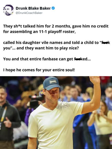 They said we'd never get a good coach. They said we poor. We go get the hottest name out there and lay out a financial package for NIL. We get to the portal and just because he didn't sign players right away, people started taking their shots because they were so wrong before. Then the motherfricker goes and buys up players left and right. They can stand that LSU and Lane keep doing everything they said we couldn't.