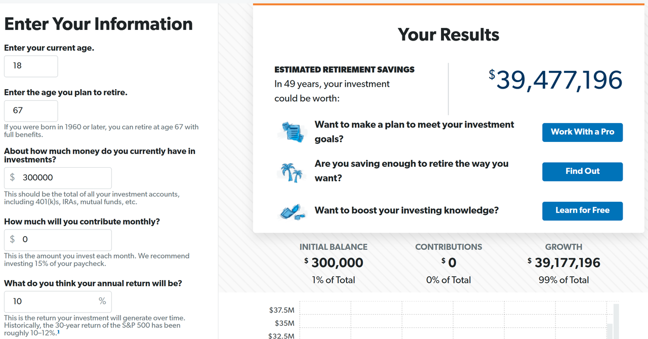 • Roth final value at age 67: ~$39.48 million tax-free (for $300k starting amount; ~$39.18 million for $298k).